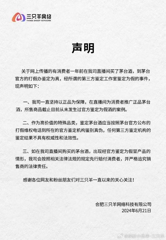 蓝鲸新闻6月21日讯(记者 朱欣悦)就消费者称在直播间买到假茅台酒一事,6月21日,微博名“疯狂小杨弟-三只羊”发布声明称,作为高价值的特殊品类,鉴定茅台酒应当按照茅台官方公布的打假维权电话到所在的官方鉴定机构鉴别真伪,任何第三方鉴定机构的鉴定结果不具有权威性和法效性。