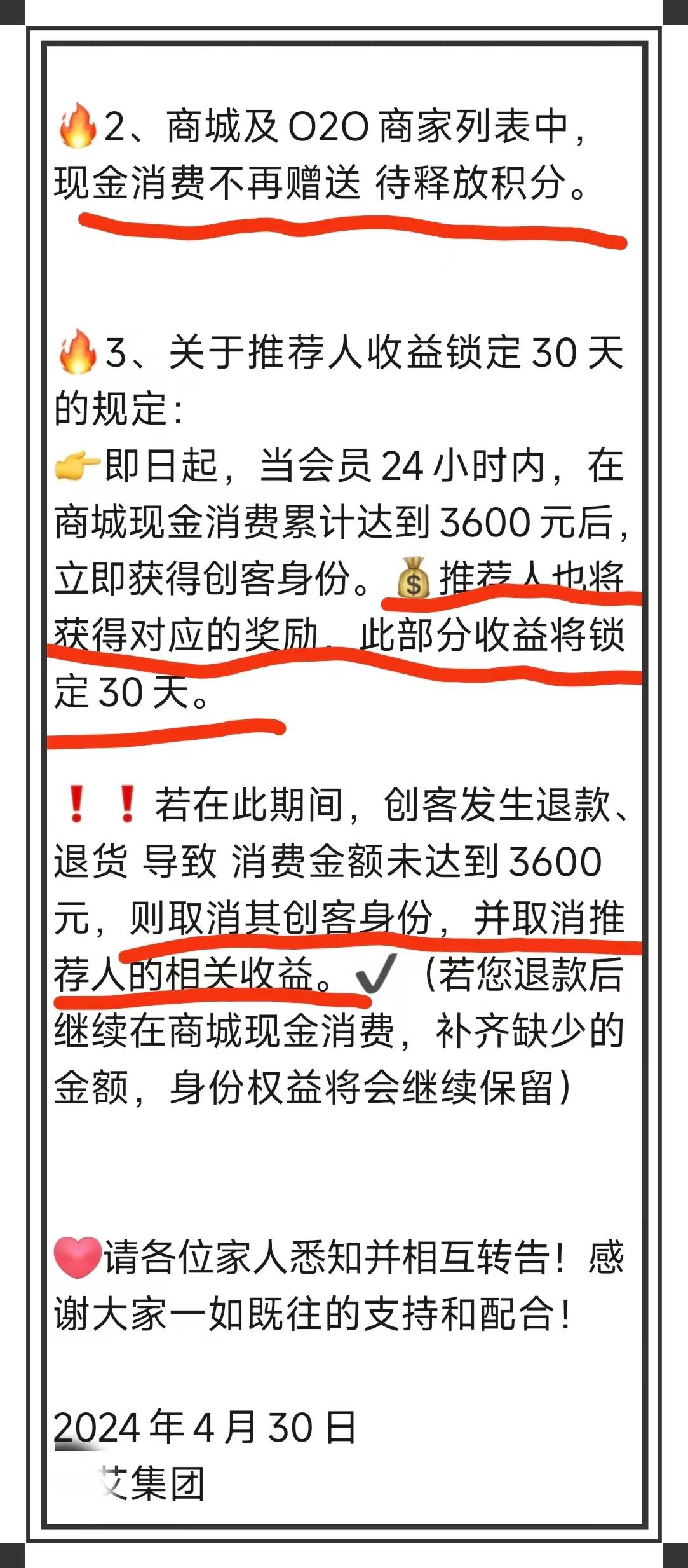 这不,官方开始出来自救,不但规定现金消费不再赠送待释放积分,推荐人的收益也被锁定30天后才能提取。如果这期间“创客”发生退款,推荐人的相关受益也会被取消。