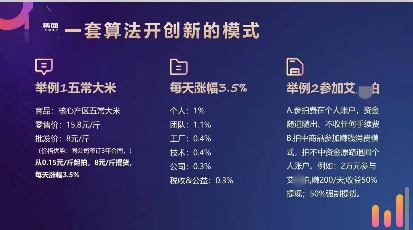 这些商品每天按照3.5%的利润增值,其中个人占1%,团队、工厂、技术、平台以及税收公益占剩下的2.5%。