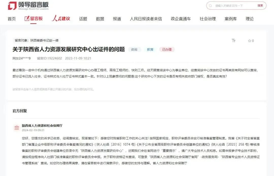 去年11月,有网友在领导留言板上对陕西省委书记赵一德提问:“最近看到一些中介机构通过陕西省人力资源发展研究中心办理工程师、高级工程师的,快则三月。经查询该中心发放的证书在其自有网站可以查询,部分证书已流入社会,证书样式与人社厅证书样式基本一致。请问这个中心下发的证书是否有相关政府部门授权,是否真实有效?”