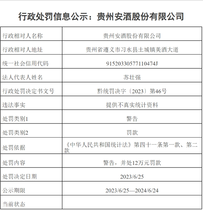6月25日,贵州安酒股份有限公司就收到了一纸来自贵州省统计局的行政处罚通知书。贵州省统计局的行政处罚信息公示显示,由于提供不真实的统计资料,违反《中华人民共和国统计法》,贵州安酒被处罚12万元罚款。