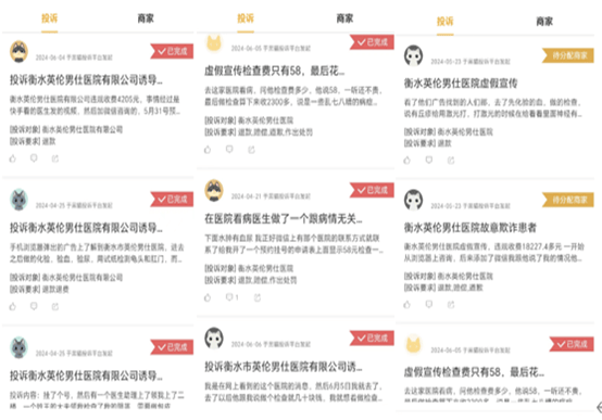 新浪旗下消费者服务平台“黑猫投诉”显示:衡水英伦男仕医院有限公司共有22条投诉信息。时间自2023年11月至2024年6月,投诉内容大多为虚假宣传、诱导消费、夸大病情、恶意欺诈、过度医疗等,要求退赔的费用从近千元到一万多元不等。