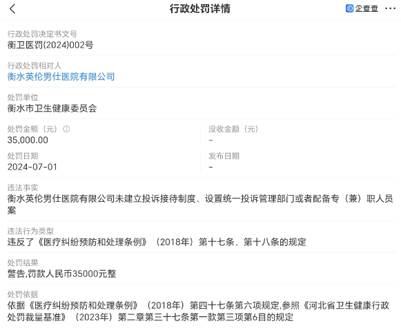 7月1日,衡水市卫生健康委员会作出衡卫医罚(2004)002号处罚决定书,对衡水英伦男仕医院有限公司违反《医疗纠纷预防和处理条例》(2018年)第十七条、第十八条的规定,未建立投诉接待制度、设置统一投诉管理部门或者配备专(兼)职人员案的违法事实予以警告,罚款人民币35000元整。