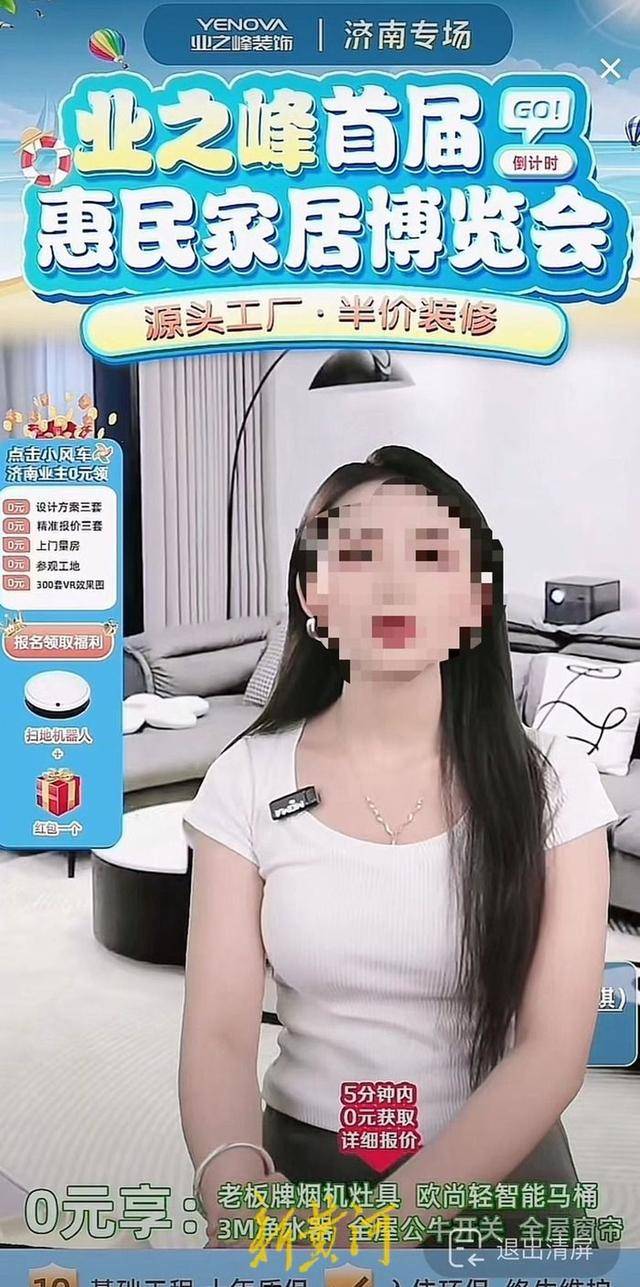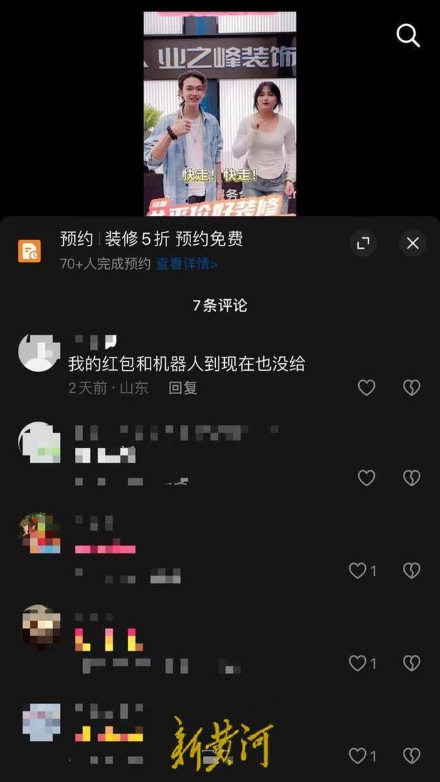 新黄河记者在抖音检索济南业之峰官方总监号发现,该账号属于济南业之峰装饰工程有限责任公司章丘分公司。而在济南业之峰官方总监号直播间内,主播的背景画面介绍中,的确展示着“济南业主0元领 报名领取福利”,主播也不停介绍,“济南业主只需留下联系方式,即可获得扫地机器人。”同时在该账号作品的评论中,也有市民回复表示“红包和机器人到现在都没给”。