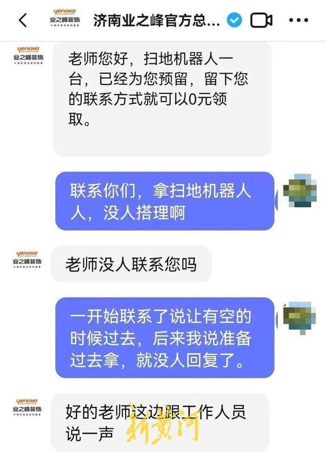 但是在按照要求填写联系方式后,王先生并没有等到业之峰工作人员的后续联系。“没人联系我之后,我就去直播间询问为什么没有人联系,结果被拉黑了。”同时,王先生还表示,其间曾添加过济南业之峰相关工作人员的微信,但该名工作人员对于何时可以领取扫地机器人的情况并没有回复。“那个微信号添加之后,光问近期要不要装修等等。后来我和他聊完,再询问什么时候能去拿扫地机器人,就不再回复了。”