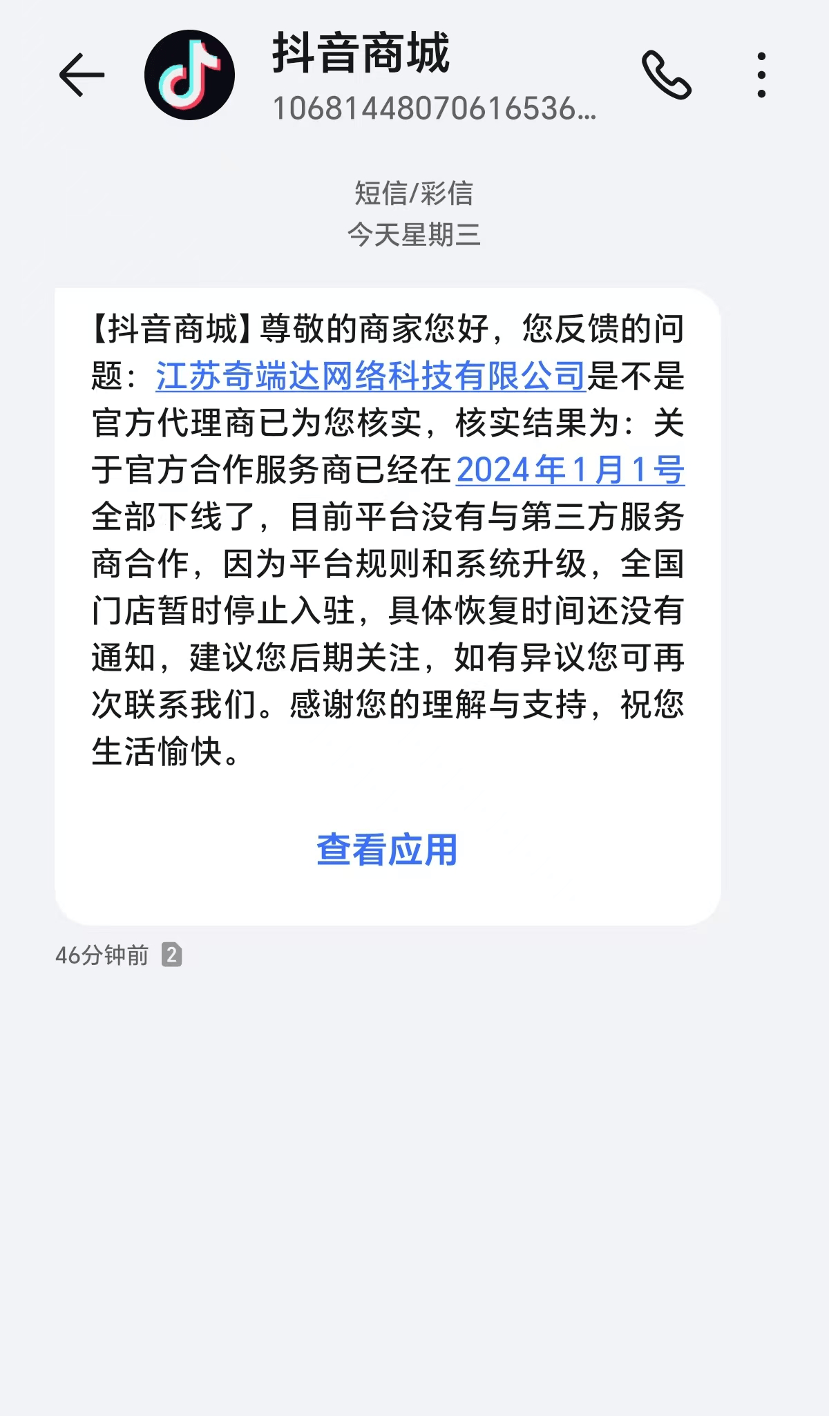 她赶紧在网络上搜索江苏奇端达服务有限公司的相关信息,却惊愕地发现,有不少人都声称这是一场骗局。她随即向抖音官方客服核实,得到的答案让她心如刀绞:“目前小时达业务暂无第三方人员进行邀请入驻。”而对方也改口称:“自己是抖音平台小时达业务的运营公司”。