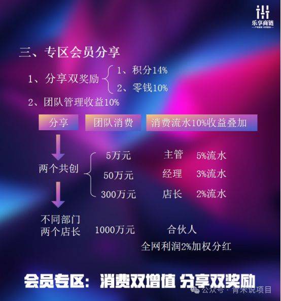 用户参与推广可以获得下级消费额14%的积分和10%的现金。推广两个共创会员后当团队业绩达到5万、50万、300万元时可以对应的升级为主管、经理、店长,分别可以获得团队业绩的5%、3%、2%的消费流水分红。当下级中有两位店长时,业绩达到1000万元可以升级为合伙人,获得全网利润2%加权分红。