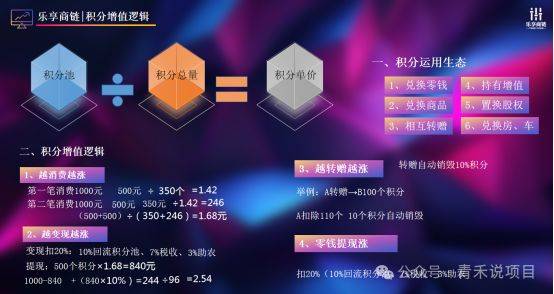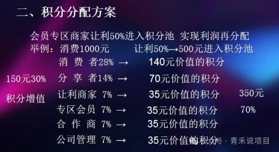 在用户消费时,商家让利出50%,让利部分中的30%用于积分增值,70%转化为积分参与分配:消费者28%、分享者14%、让利商家7%、专区会员 7%、合作商 7%、公司管理 7%。