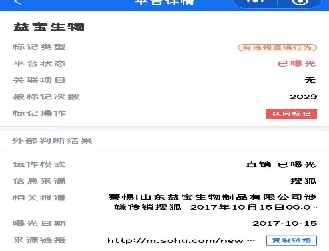 记者通过“腾讯灵鲲金融风险查询举报中心”查询发现:“益宝生物”曾被标记2029次,标记类型:有违规直销行为,平台状态:已曝光。