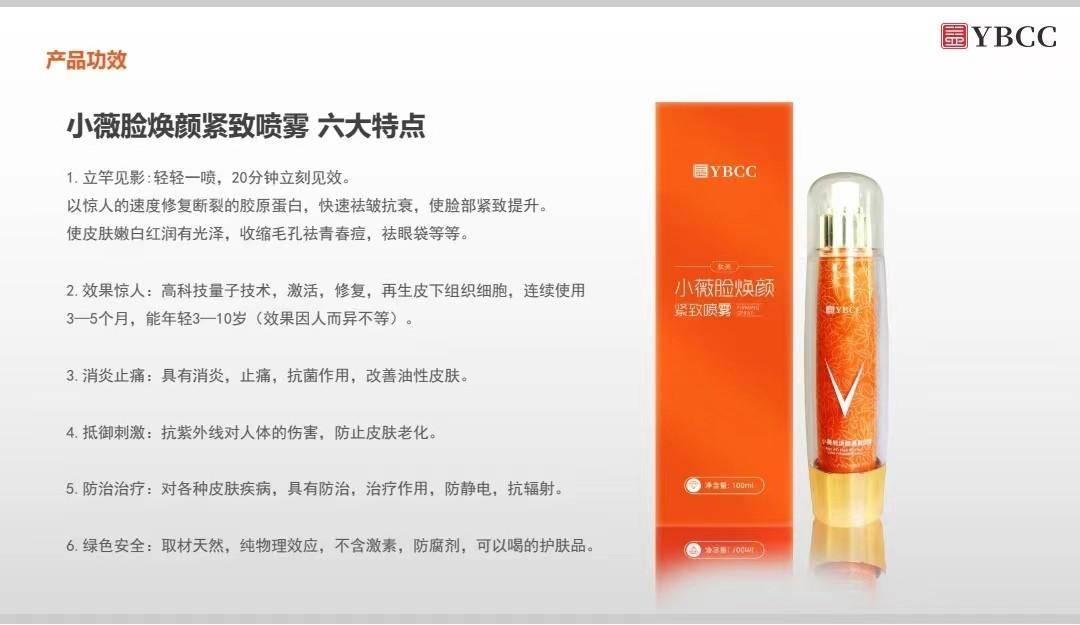 当介绍到益宝生物的小薇水时,讲师称该产品可以修复断裂的胶原蛋白,快速祛皱抗衰,祛眼袋,并具有提拉紧致、消炎镇痛、防晒之功效。往嘴里喷,还能有效缓解口腔溃疡。真是一款神水。