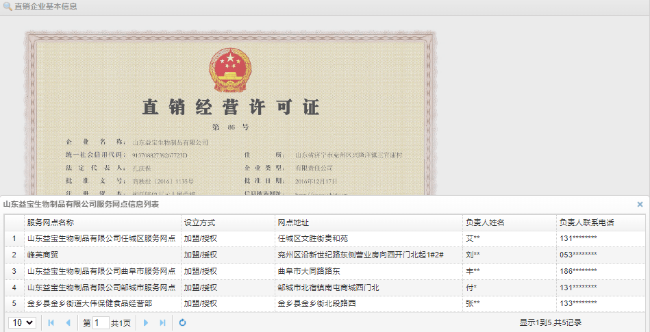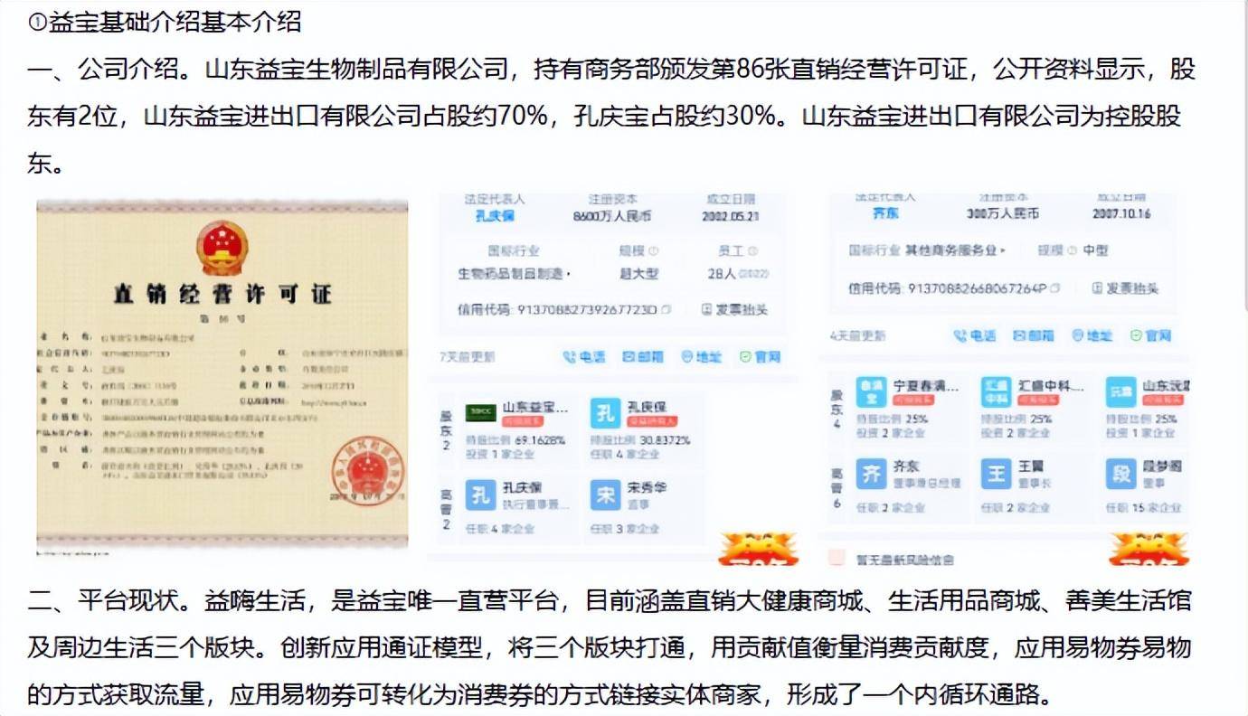 商务部公开信息显示:山东益宝生物制品有限公司于2016年12月27日获批第86号直销经营许可证,法定代表人孔庆保。该公司投资者名称分别为宋秀华29.63%、孔庆保30.84%、山东益宝进出口贸易有限公司39.53%。
