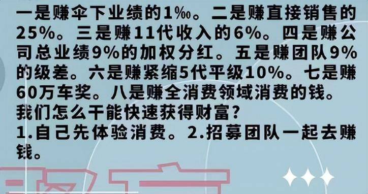 而益宝(中国)“益嗨生活”平台的奖金模式,则简单概括为:“一是赚伞下业绩的1‰;二是赚直接销售的25%;三是赚11代收入的6%;四是赚公司总业绩9%的加权分红。五是赚团队9%的级差;六是赚紧缩5代平级10%;七是赚60万车奖;八是赚全消费领域消费的钱”。