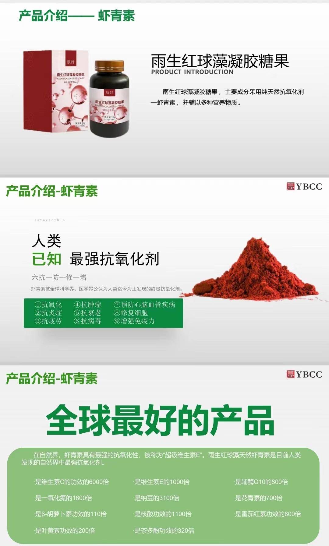 而红球藻虾青素则被冠以“全球最好的产品”,具有“五抗一防”的功效,吃了60秒钟就开始产生作用,12小时之后快速修复细胞,恢复身体状态。该讲师还称自己血糖高,血脂高的母亲,吃什么都没用,中医调理也没用。吃了2瓶以后,没有头晕的症状了。讲师还分析到,这款产品是一款保健食品,但它可以调理你身体内所有器官的细胞。并且可以达到抗衰老,抗氧化,抗病毒,软化血管,预防心脑疾病发生之功效。