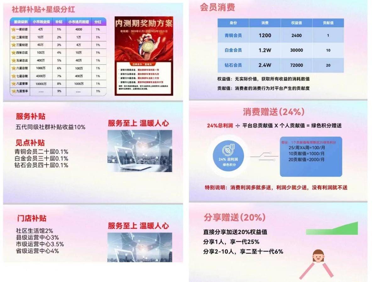 第四项社群补贴:从1星到9星。小区达到4万业绩叫一星;10万业绩叫二星;40万叫三星;100万叫四星。还有9%级差,全网业绩加权分红。