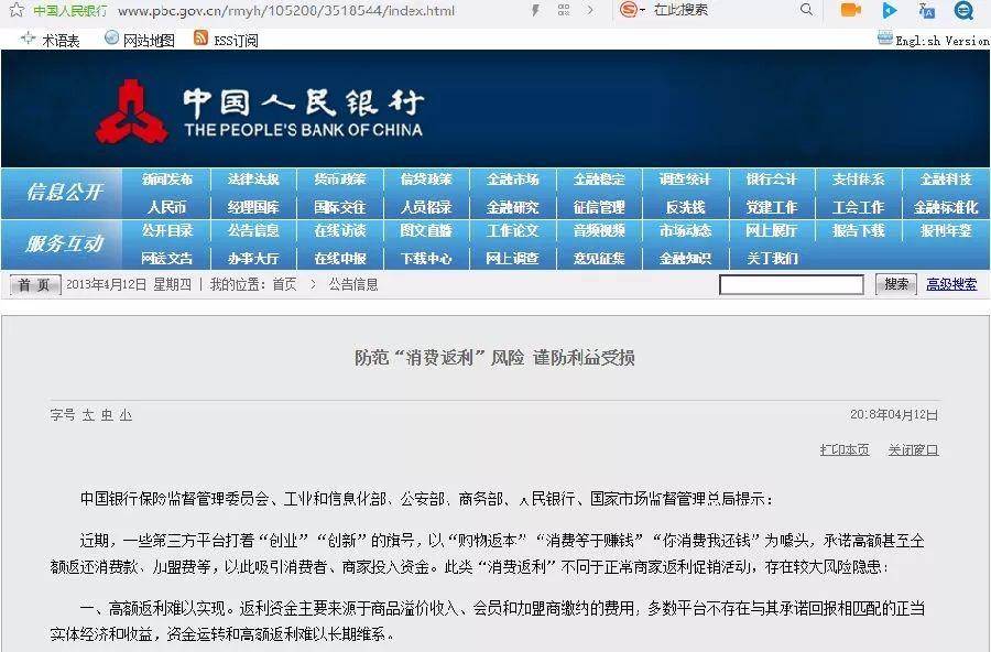 2018年4月中国银行保险监督管理委员会、工业和信息化部、公安部、商务部、人民银行、国家市场监督管理总局联合出台《防范“消费返利”风险 谨防利益受损》的风险提示,直指消费返利行为存在的巨大风险隐患。