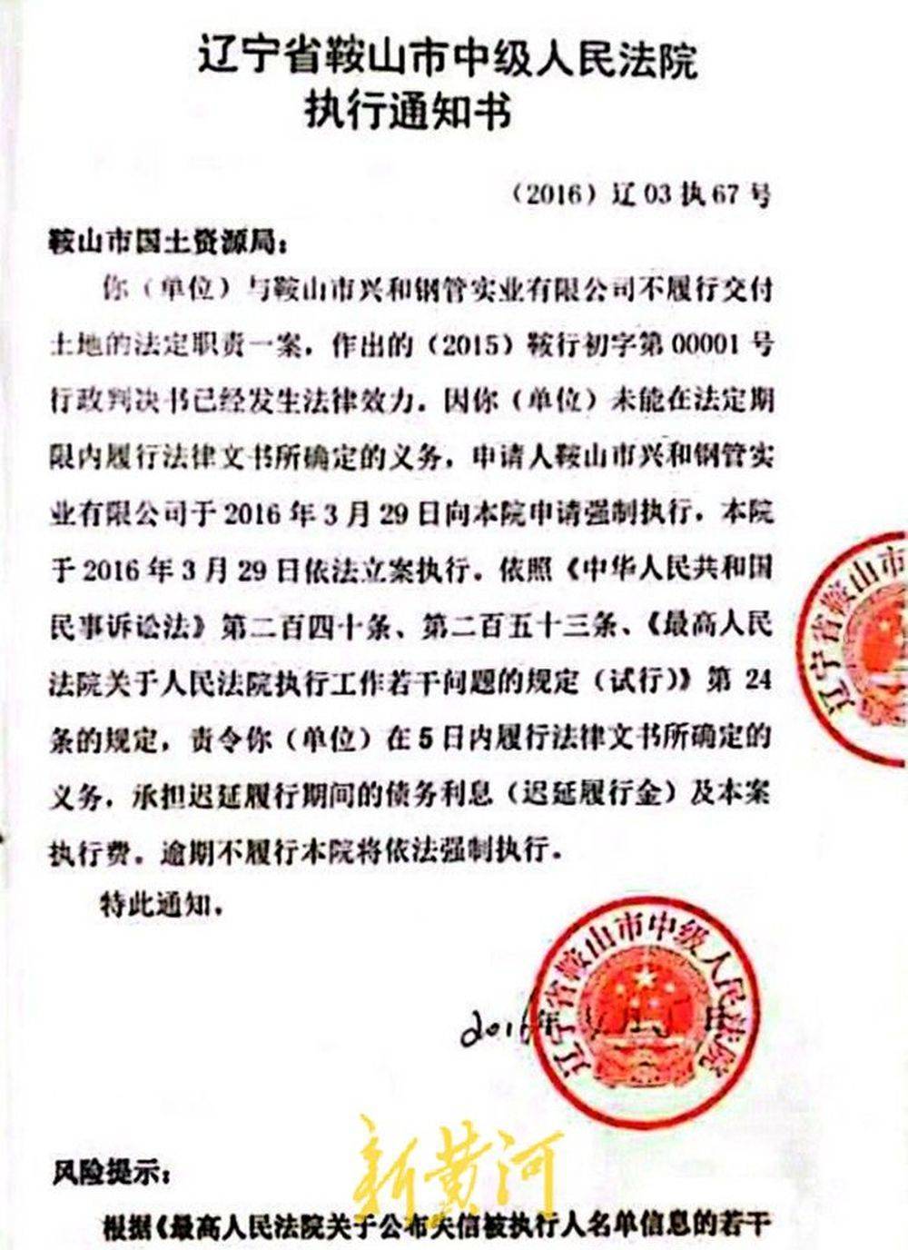 2016年3月,兴和公司向鞍山中院申请执行,鞍山中院作出的执行通知书中载明:责令鞍山国土局在5日内履行法律文书所确定的义务,承担迟延履行期间的债务利息(迟延履行金)及本案执行费。逾期不履行本院将依法强制执行。同年6月,鞍山中院执行局冻结了鞍山国土局的银行账户存款978万元。就在王键以为这场官司即将画上句号时,事情的发展却出乎了他的预料。