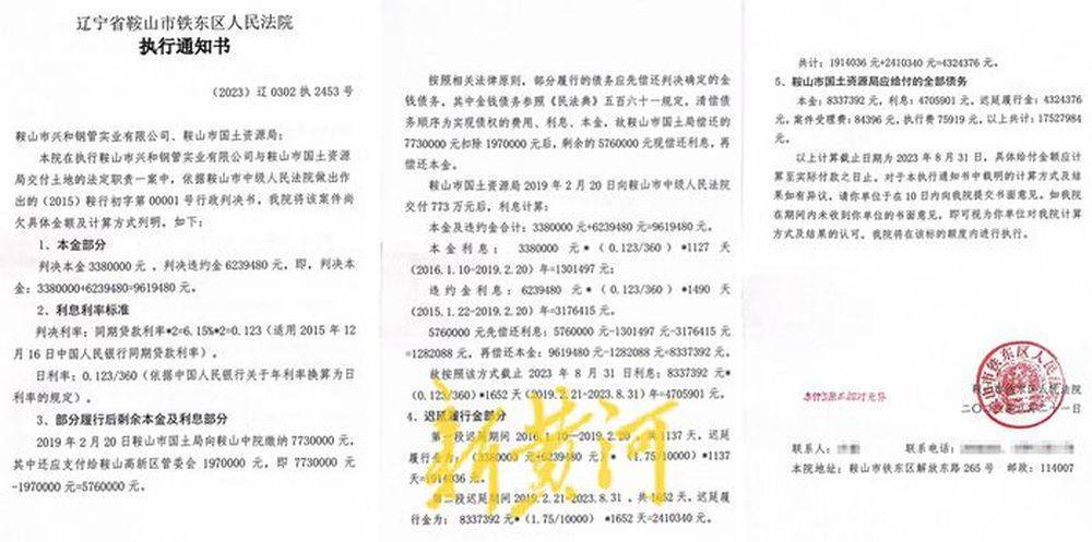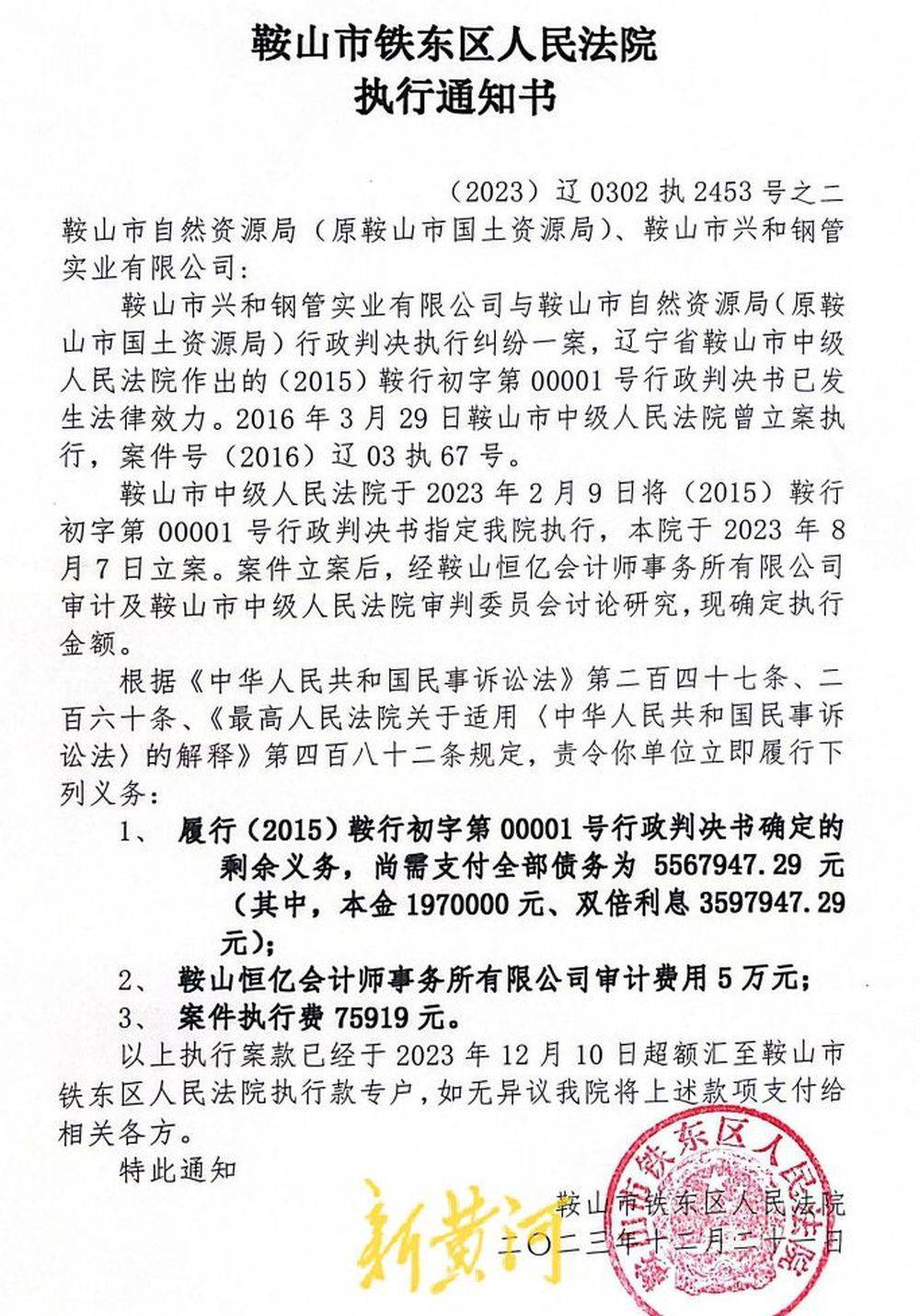 2023年2月,这起长期未决的执行案件得以重启,并由鞍山市铁东区人民法院(简称“铁东法院”)执行。同年8月,铁东法院作出执行通知书,确认鞍山市自然资源局还需支付兴和公司剩余本金、利息、违约金等共计1752万余元。在鞍山市自然资源局提出异议后,铁东法院委托会计师事务所审计,将执行金额降至1509万余元;2023年12月,铁东法院又将执行款金额降至556万余元。