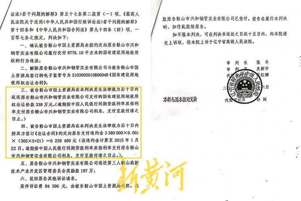 经过多次审理,2015年年底,鞍山中院作出行政判决,判决被告鞍山国土局未能履行交付相关用地使用权的行为违法,解除《出让合同》,返还原告兴和公司土地出让款338万元,并需向兴和公司支付截至2015年1月22日的违约金623万余元。两笔款项共计961万余元,若鞍山国土局逾期未付,均需按中国人民银行同期贷款利率的双倍,向兴和公司支付利息,直至款项付清。之后原被告双方均未上诉。