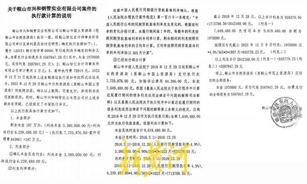 2024年5月29日,新黄河记者就这一执行款的计算依据问题,分别致电鞍山中院执行局和铁东法院执行局的负责人,未获有效回应。次日,兴和公司收到了一份《关于鞍山市兴和钢管实业有限公司案件的执行款计算的说明》(简称“《说明》”)。记者注意到,这份《说明》中的执行款计算方式与铁东法院和审计师事务所的方法存在显著差异,主要由于它采用的是先本后息的计算方式,并且未将迟延履行金纳入执行范围。