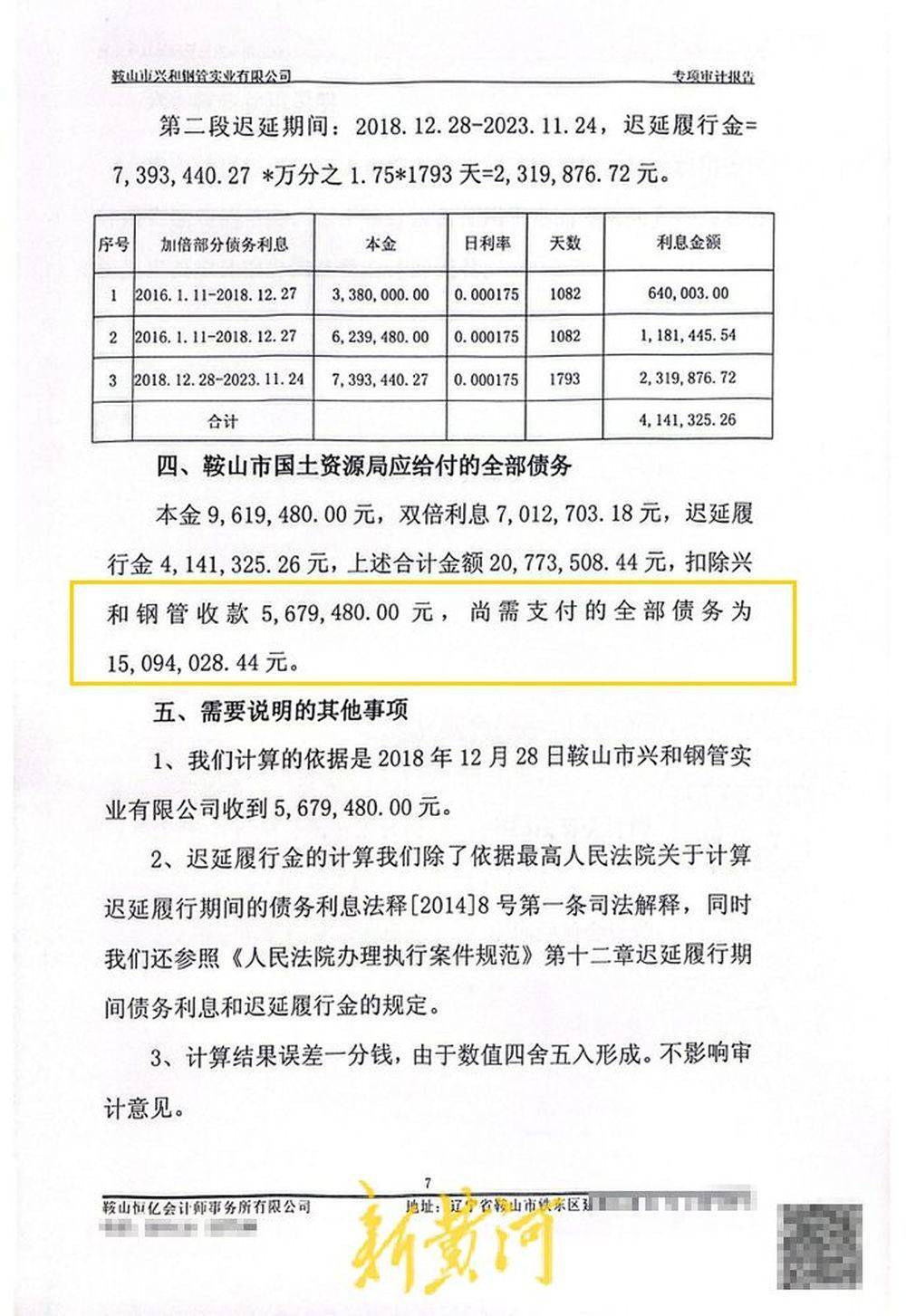 在兴和公司的持续维权下,2023年2月,这起长期未决的执行案件得以重启,并由铁东法院执行。同年8月,铁东法院作出执行通知书,要求鞍山市自然资源局还需向兴和公司支付1752万余元的债务。对于这一结果,鞍山市自然资源局提出异议。为解决争议,铁东法院根据鞍山市自然资源局申请,委托鞍山恒亿会计师事务所对执行款金额进行审计核算。经过审计,确认鞍山市自然资源局尚需支付的债务为1509万余元。