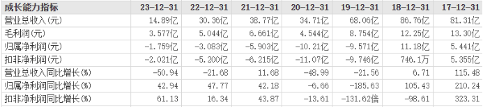 2017年-2023年,东旭蓝天实现营收分别为81.31亿、86.76亿、68.06亿、34.71亿、38.77亿、30.36亿和14.89亿;归母净利润分别为5.441亿、11.18亿、-9.571亿、-10.21亿、-5.903亿、-3.083亿和-1.759亿。