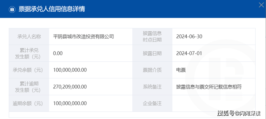 值得注意的是,在截至2024年6月30日承兑人逾期名单中 ,平阴城市改造公司的身影再次出现。7月1日披露的票据承兑人信用信息详情显示,承兑余额为100,000,000.00元,累计逾期发生额为270,209,000.00元。