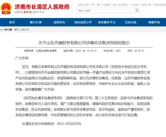 近日,长清区人民政府网站发布《关于山东齐融财务有限公司涉嫌非法集资风险的提示》,提醒广大群众提高警惕,防止利益受损。