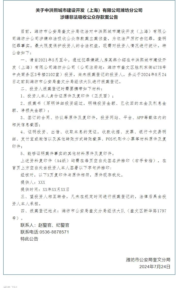 一、请自2021年5月至今,通过犯罪嫌疑人房某燕介绍在中洪熙城市建设开发(上海)有限公司潍坊分公司(公司注册地:潍坊市奎文区胜利东街4778号中央商务区3号楼2102室)投资,尚未报案登记的投资人,务必于2024年8月24日之前到潍坊市公安局奎文分局经侦大队进行报案登记。