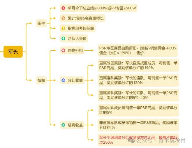 升级为军长则需要单月伞下总业绩大于等于1000万或者pr专区业绩大于等于500万、培养5名直属师长、合伙人身份、指挥部考核任命,可以享受购物折扣、直推下线pr商品销售订单分红的190%、军长的连队pr商品订单分红的130%、军长的师队pr商品订单分红的5%~40%,直推下线所销售的pr商品订单分红的5%,非直属下线所销售的pr商品订单分红的1%。
