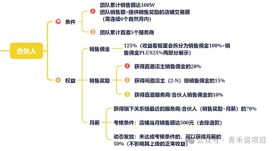 六个自然月内团队销售业绩达到100W 且直推用户中有5位服务商即可成为合伙人,合伙人除了享受服务商权益外,月薪也提升至70%。