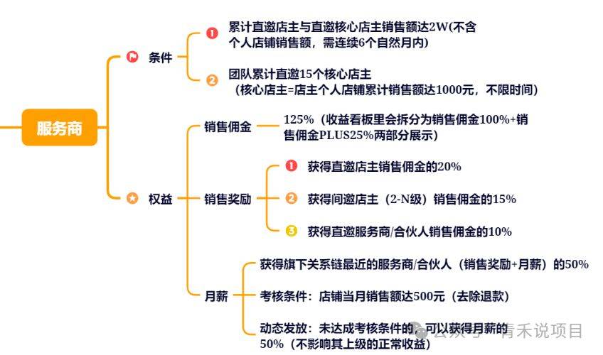 在连续6个月的时间内,累计直推销售业绩达到2万元且直推15个核心店主用户可以成为服务商。服务商直推销售佣金提升为125%,同时可以获得直推店主销售佣金20%,间接无限代15%,直邀服务商、合伙人销售佣金的10%,获得旗下关系链最近的服务商/合伙人(销售奖励+月薪)的50%。