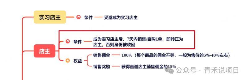 据平台推广资料介绍,参与用户注册完成后可以成为实习店主,成为实习店主后,7天内销售/自购1单,即转正为店主,否则身份被收。推广产品销售可以获得一定佣金(佣金一般为产品售价的5%~40%)。