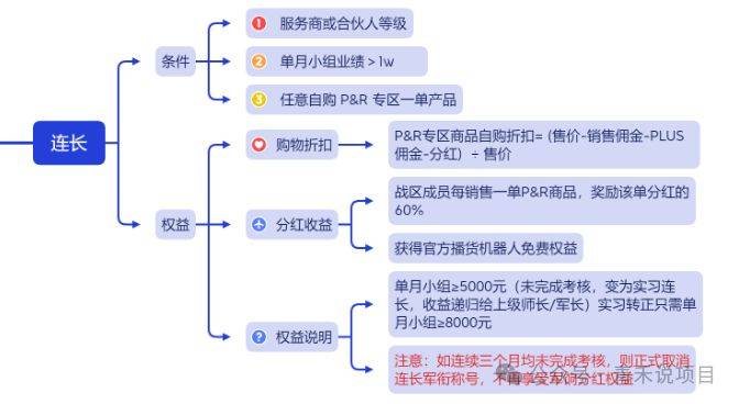 当参与用户升级为服务商或者合伙人后,单月小组业绩大于一万,并且在PR专区购买一单商品,可以成为连长,成为连长后在pr区域购买产品可享受优惠折扣,战区成员每销售一单pr产品连长可以获得该单分红的60%,同时获得官方播货机器人免费使用权益,业绩考核单组5000元/月,如果没有达到转变为实习连长,收益递归给上级,想要转正需要单月小组业绩达到8000元以上。