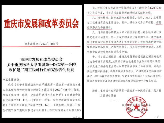 “这个项目的资金来源符合渝府令[2020]339号文,所以可研报告批复是代建制。该项目的一期是代建制,负责方是‘城发公司’,二期由于代建费用没谈好,还在扯皮阶段,重医附一院就违规自己招标了。”举报人称。
