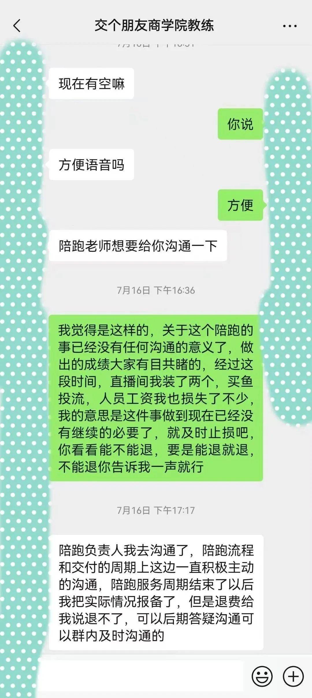 “业绩摆在眼前,陪跑团队也觉得面子挂不住,给出了建议再陪跑一段时间,但被我拒绝了,我通过这一个月,认定了这件事情是毫无意义的。我把直播间的工作,也基本都停掉了。也问过是否能退部分款,回答很坚决,不退。再之后,就对我们的诉求爱答不理了。”李可说道。