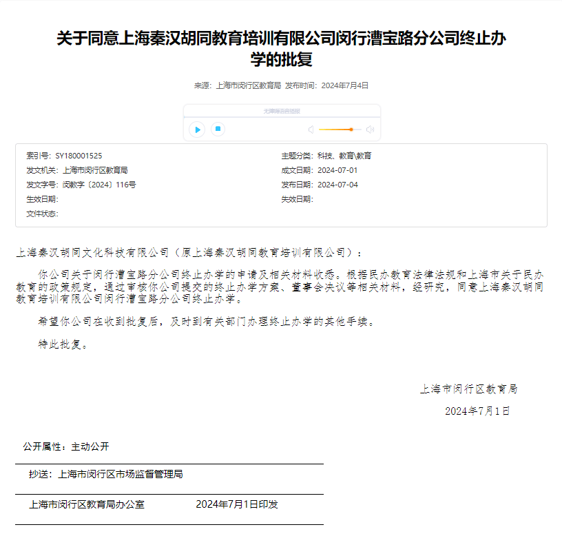 据记者查询获悉,今年4月,秦汉胡同闵行第一分公司的终止办学申请便已经获得了上海闵行区教育局的同意批复。此后7月,闵行漕宝路分公司的也获得了同意终止办学的批复。