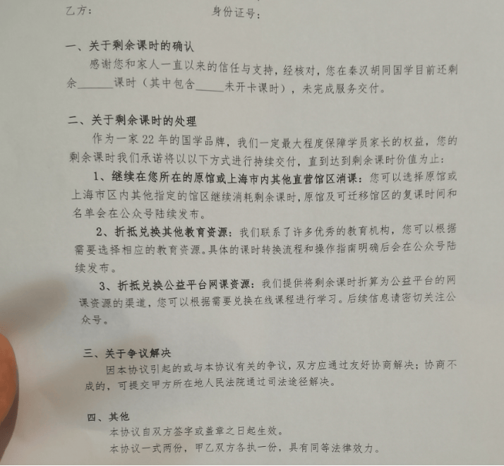 根据协议,秦汉胡同给出了继续在所在的原馆或上海市内其他直营馆区消课、折抵兑换其他教育资源、折抵兑换公益平台网课资源三种解决方案。