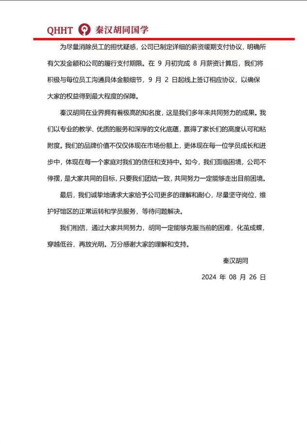 秦汉胡同在信中表示,2024年8月中旬,个别员工在社交媒体发布“倒闭”的言论,受之前工资缓发事件影响,迅速变成大面积恐慌,各校区正常经营受到严重干扰。对此,创始人及核心团队第一时间成立紧急运营小组,进行沟通处理。