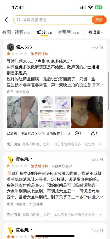 “一个年轻的医生给我打的,那咨询说没问题,结果打胶原蛋白这种没啥形态的都打青了,过了快半个月还青着呢,化妆都遮不住,很少这样,以后打眼周这种精细部位千万别找这种打”,“做光子嫩肤烫伤的医生态度不太好!跟我说这个有风险然后就真的被烫伤了我简直无力吐槽啊”。