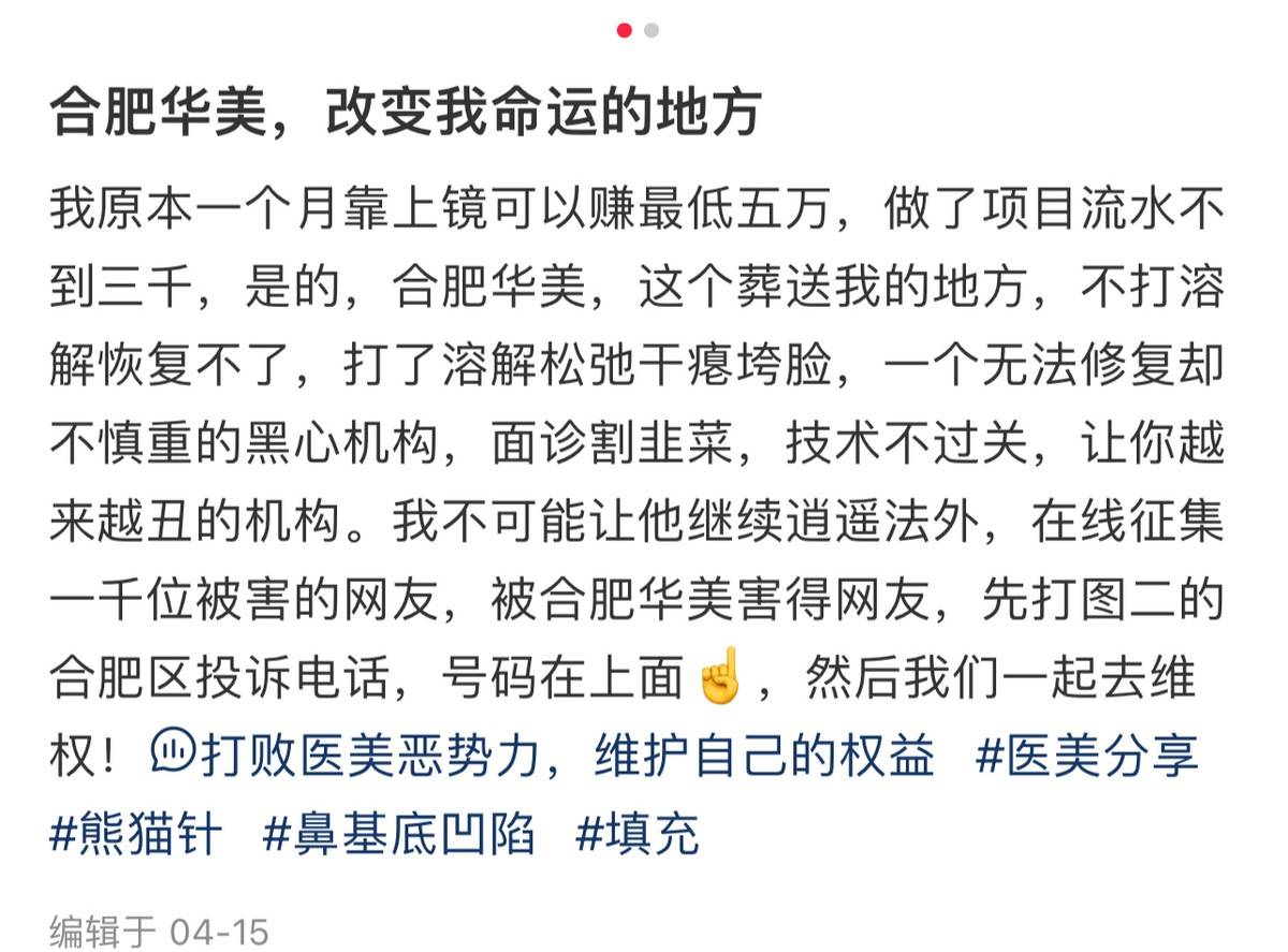 4月17日,有消费者称,在合肥华美整形外科医院做了一项流水仅3000元的“熊猫针”针剂的项目,但是却毁了自己一生。