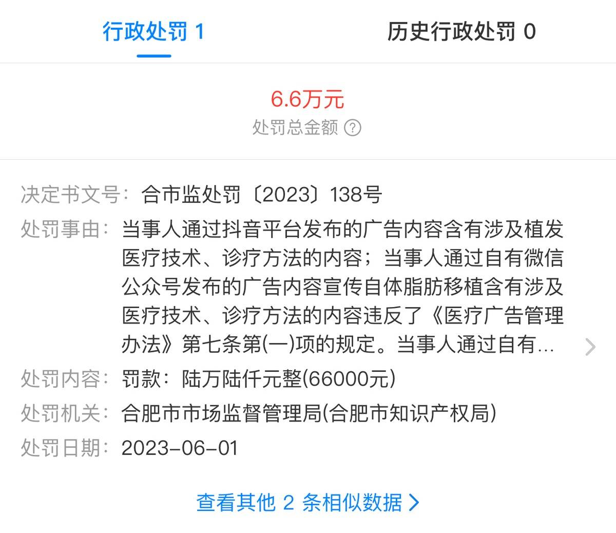 天眼查上,也仅显示这一次行政处罚,上文中报道过的处罚,不知为何,已经查询不到了。