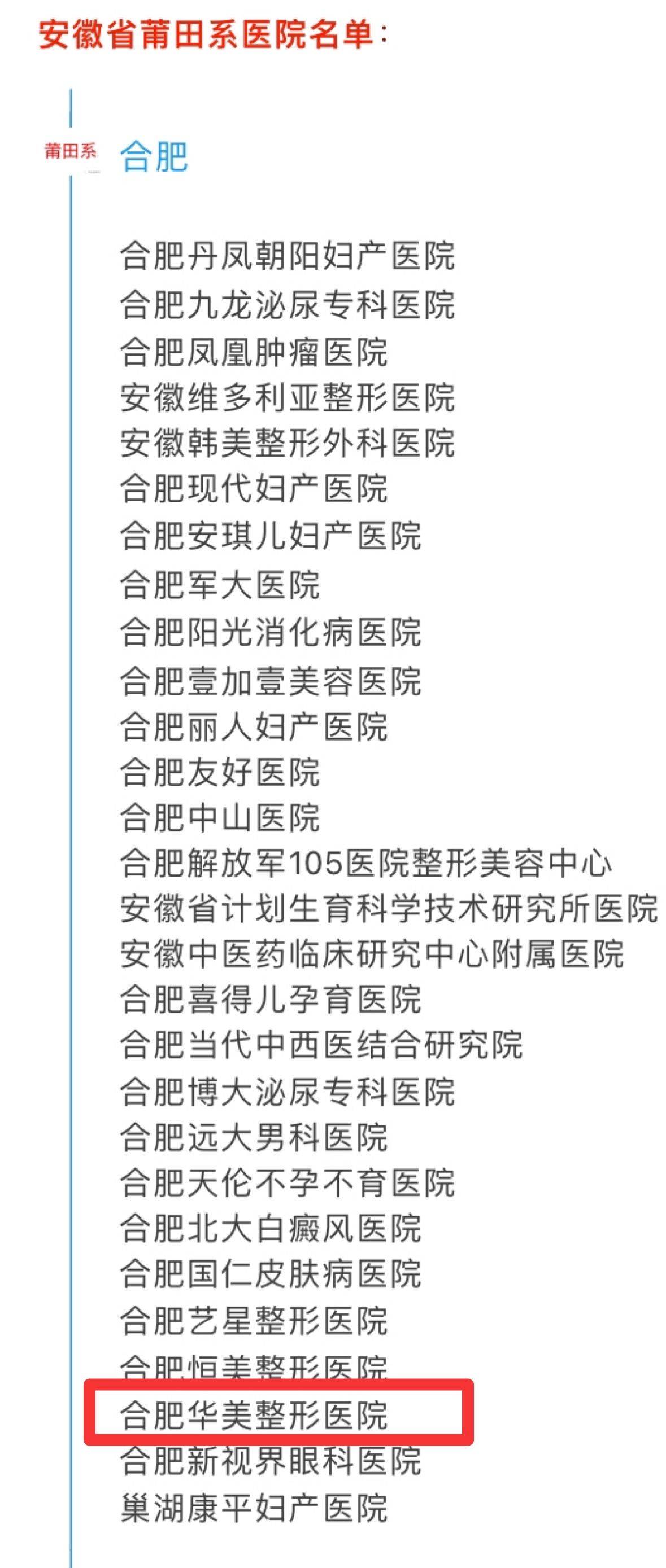 最重要的直接指向性证据,则是皖美青年曾在2016年对安徽省莆系医院进行了大摸底。并直接列出了合肥的莆系医院名单,其中,合肥华美赫然在列。