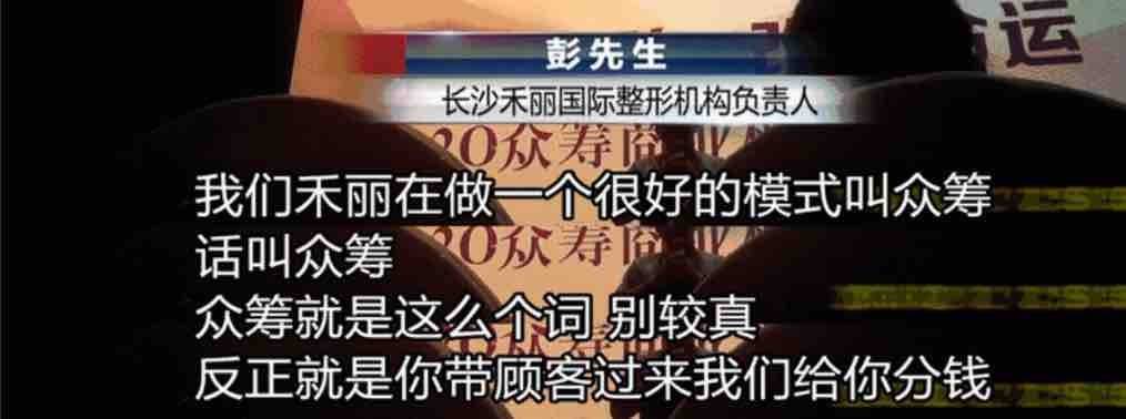 2017年夏天,有长沙市民向潇湘晨报记者反映,长沙市雨花区一家名为禾丽医疗美容的整形机构,一般不接待个人用户,打着“众筹”“共享经济”的旗号发展合作商,以合作商名义拉人头发展客户,来获得40%以上的业务提成。同时,在医院内还在从事着“血液净化”等与美容行业无关的项目。
