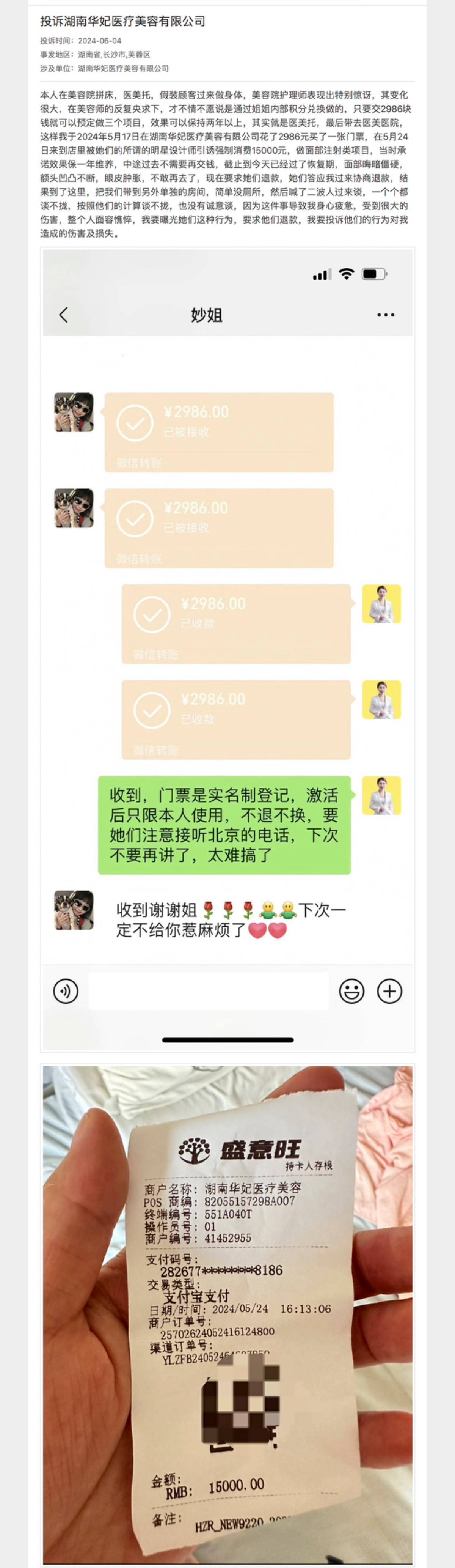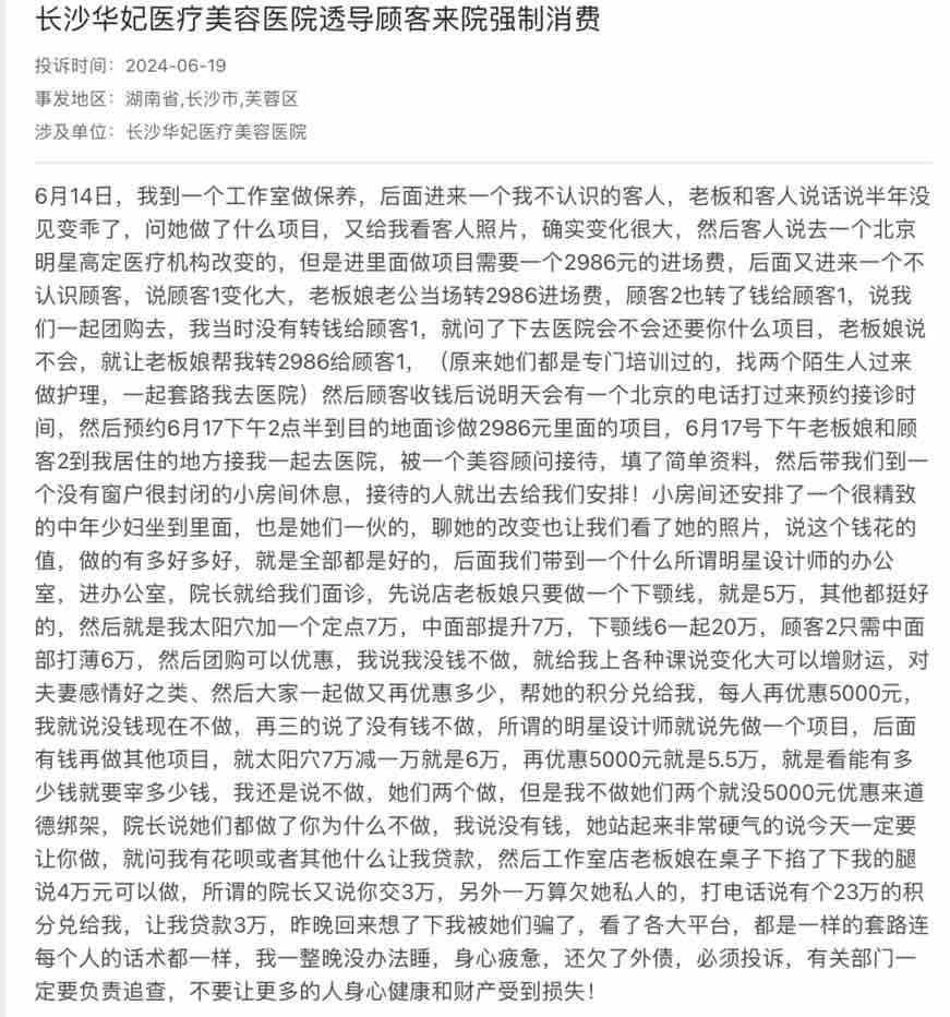 记者通过采访发现,曾有多名消费者反映在美容院遭遇了“拼房”情况。刘文(化名)和田甜(化名)也有类似的经历,刘文表示,自己在美容院拼床遭遇了医托,该医托假装顾客过来做身体,美容院护理师表现出特别惊讶,说她变化很大,在美容师的反复央求下,才不情不愿说是通过姐姐内部积分兑换做的,对方说只要交2986块钱就可以预定做三个项目,效果可以保持两年以上,最后她们于2024年5月17日将刘文带去湖南华妃医疗美容有限公司,并让她花了2986元买了一张门票,在5月24日,刘文自述再次来到店里时,因被她们的所谓的明星设计师引诱强制消费15000元,该机构为她做的是面部注射类项目,当时承诺效果保证一年,中途过去不需要再交钱,但是,截止到目前,她的面部已经到了恢复期,面部晦暗僵硬,额头凹凸不断,眼皮肿胀。刘文本想与机构协商退款,结果到了该机构,就被带到另外单独的房间,简单没厕所,也没有诚意谈,因此导致刘文身心疲惫,受到很大的伤害,整个人面容憔悴。她要投诉他们的行为对我造成的伤害及损失。据悉,田甜也是同样遭遇,刘文与田甜分别在华妃医美消费了15000元和8万元。田甜的部分消费甚至是在医院工作人员的引导下通过“医美贷”完成的。