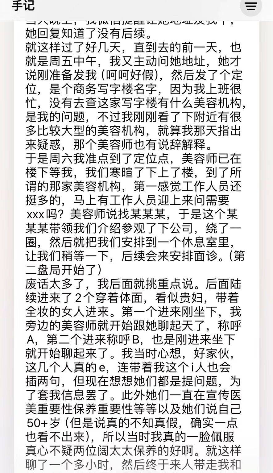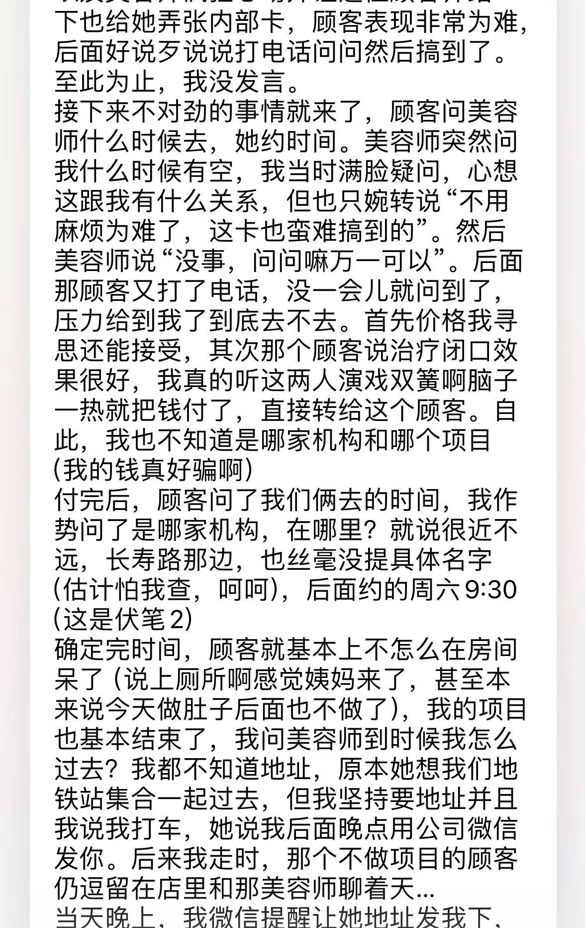 当她向美容师询问具体时间和地点时,对方一直含糊其辞,仅告知周六9:30见面,剩下的什么也没说。直到周五,该网友才收到她发的一个商务写字楼的定位。