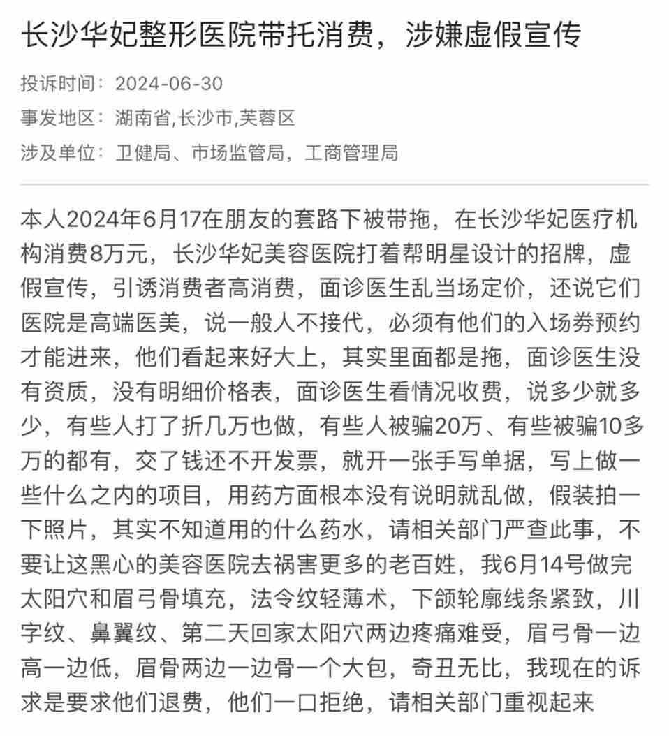 消费者李丽意识到,自己或许也陷入了一个环环相扣的所谓美容院“拼房”骗局。近期,多名消费者在《湘问·投诉直通车》栏目中反映,自己在湖南华妃医疗美容有限公司(以下简称“华妃医美”)被诱导消费,花费了数万元进行医美项目。