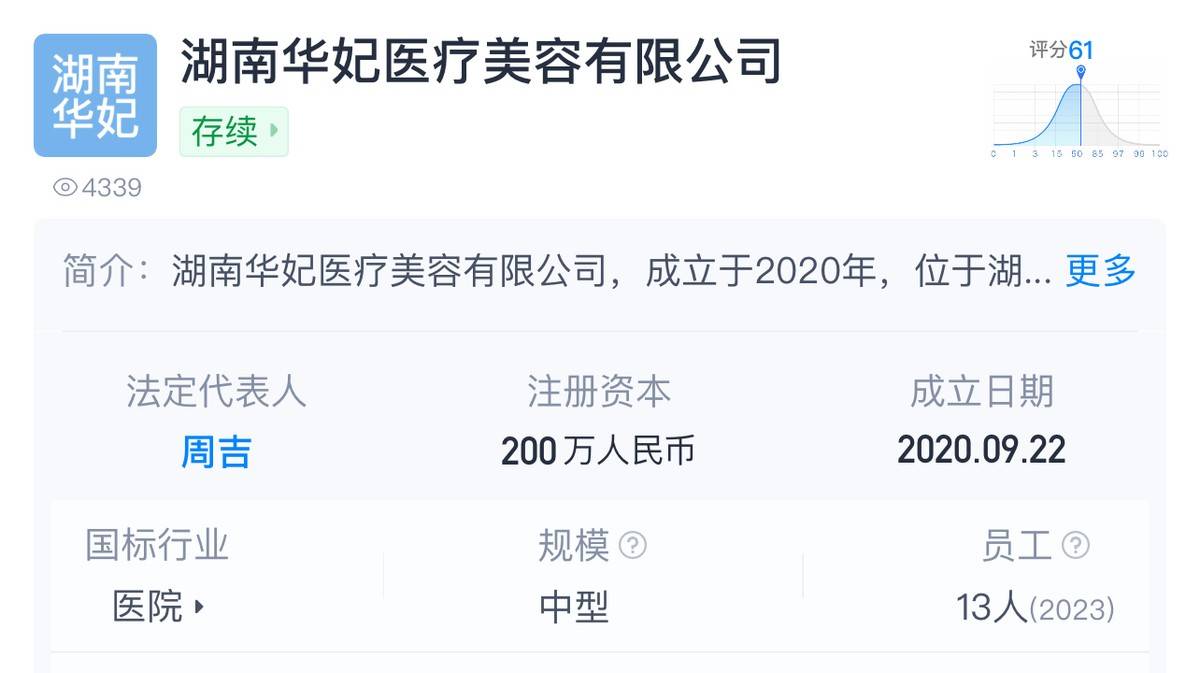 公开资料显示,湖南华妃医疗美容有限公司成立于2020年,成立仅4年时间。