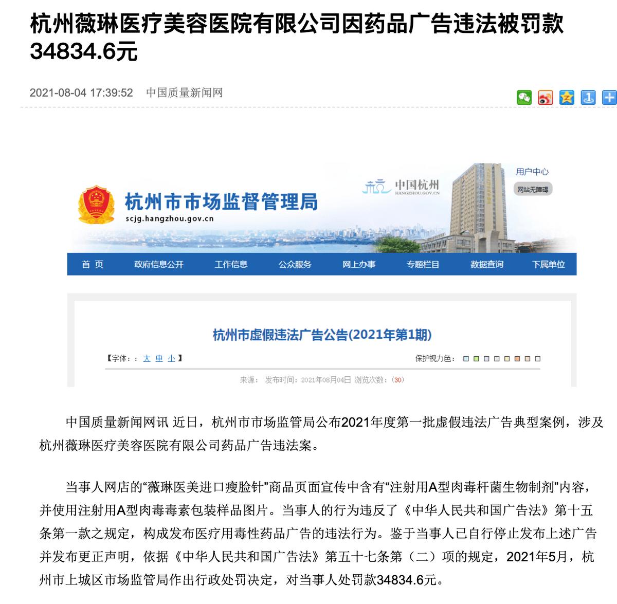 据悉,当事人网店的“薇琳医美进口瘦脸针”商品页面宣传中含有“注射用A型肉毒杆菌生物制剂”内容,并使用注射用A型肉毒毒素包装样品图片。当事人的行为违反了《中华人民共和国广告法》第十五条第一款之规定,构成发布医疗用毒性药品广告的违法行为。鉴于当事人已自行停止发布上述广告并发布更正声明,依据《中华人民共和国广告法》第五十七条第(二)项的规定,2021年5月,杭州市上城区市场监管局作出行政处罚决定,对当事人处罚款34834.6元。
