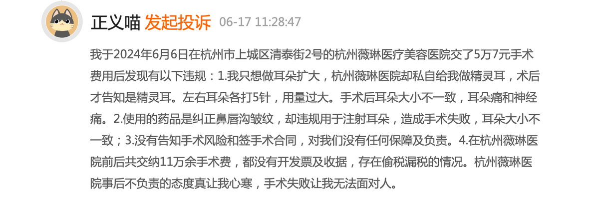 值得注意的是,“在杭州薇琳医院前后共交纳11万余手术费,都没有开发票及收据,存在偷税漏税的情况。杭州薇琳医院事后不负责的态度真让我心寒,手术失败让我无法面对人”。