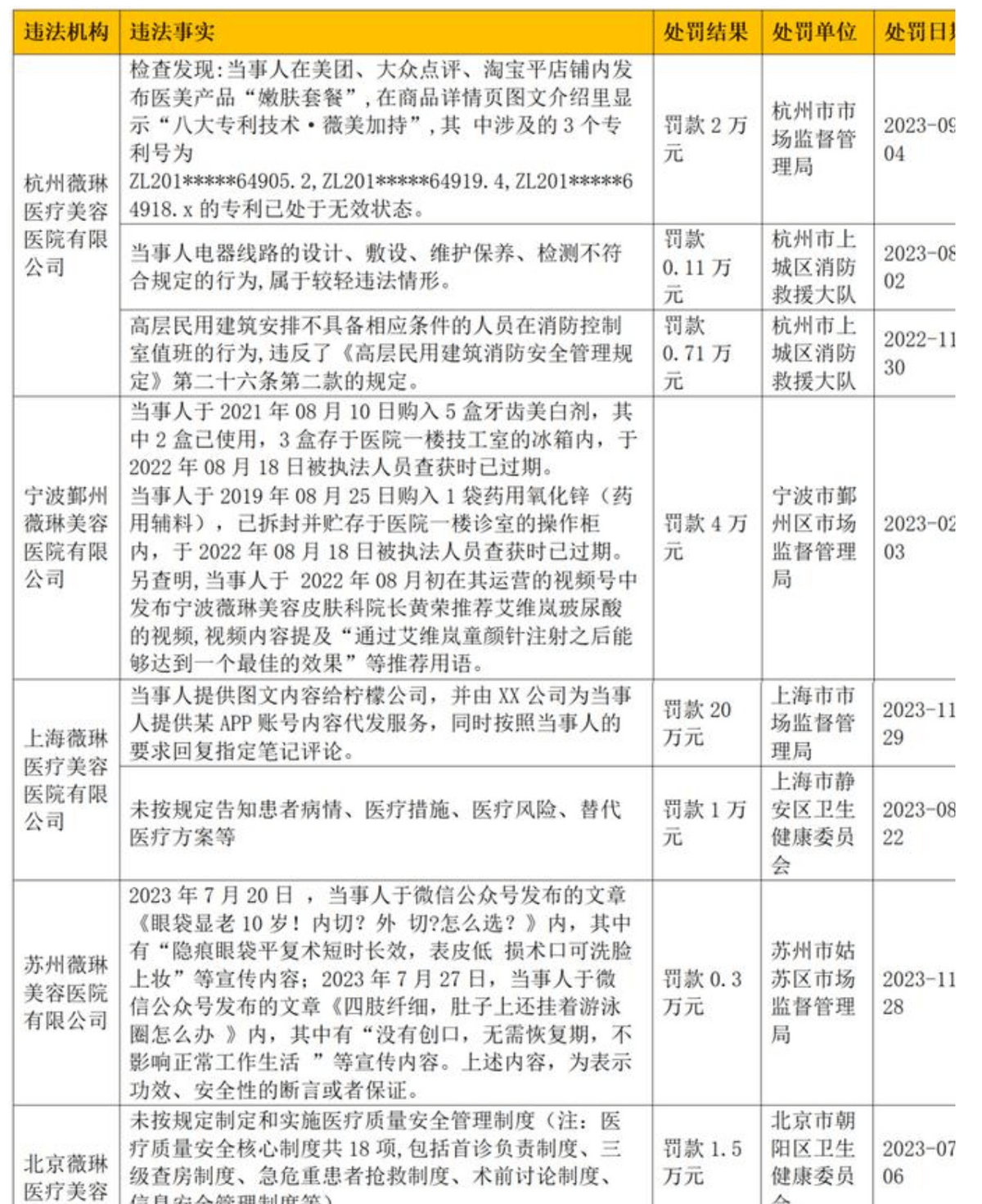 此外,薇琳医美在过去更是曾以“因虚假宣传、产品过期等被处罚80余次”的“战绩”引发过广泛关注。